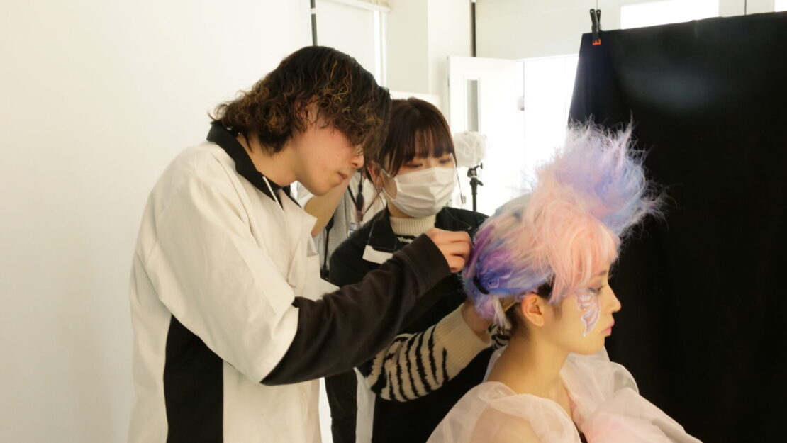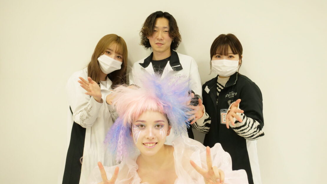 Universeとは、「宇宙」「時空」などを意味します。宇宙のイメージを強調し全体的に明るい色にしました。ヘアスタイルはあまり思いつかない発想をしました。ヘアカラーは青・紫・ピンクの宇宙感のある3色を使用しました。メイクは目元にヘアスタイルと同じ3色を加えました。右目の下に蝶の羽が描いてあるので、ぜひ注目していただきたいです。